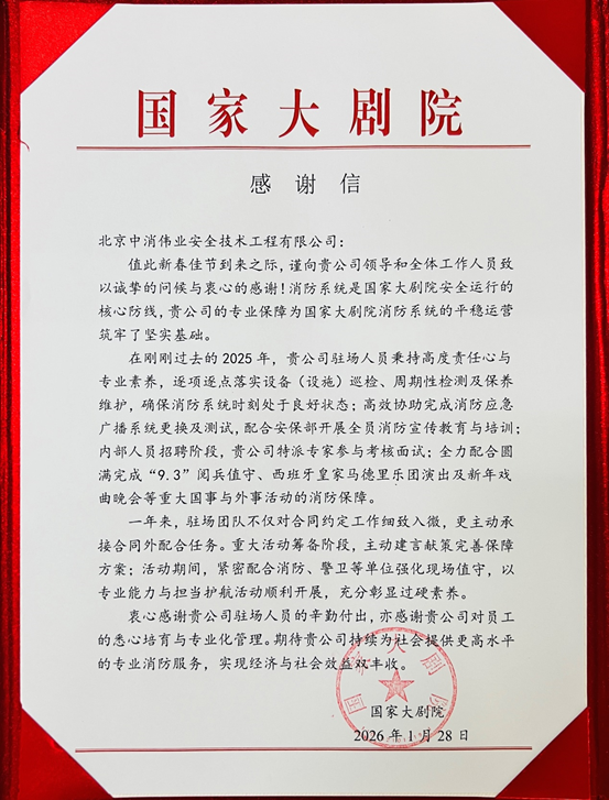 同时,金宝华同志长期负责国家大剧院维保项目,二十余年来兢兢业业、精益求精,持续为大剧院的平稳运行提供坚实保障,展现出极高的专业素养和责任心。国家大剧院特向我公司发来感谢信,对金宝华同志及其团队的长期优质服务表示诚挚谢意。